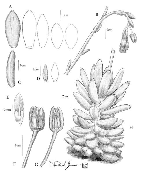 Figure 1: Pachyphytum theodactylum E. Carreño, A. Gasca-Prieto, Quirarte & J. Caltzonzi. A. variation in leaf shape; B. lateral view of the inflorescence; C. lateral view of a leaf; D. adaxial and abaxial faces of the peduncle bracts; E. inner face of the petal; F. lateral view of the flower; G. inner parts of the flower; H. lateral view of a rosette. Illustration based on E. A. Carreño-Plascencia et al.7 (IBUG), by H. David Jimeno Sevilla.