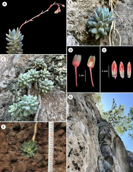 Figure 2: Pachyphytum theodactylum E. Carreño, A. Gasca-Prieto, Quirarte & J. Caltzonzi. A. habit; B. upper-lateral view of a solitary rosette; C. pendant rosettes growing ona vertical slope of extrusive igneous rocks; D. lateral view of the flower (left) and the inner parts of it (right); E. inner face of the petals; F. rosette with a long stem; G. habitat. Photos by Emmanuel Carreño Plascencia and Aureliano Gasca Prieto.