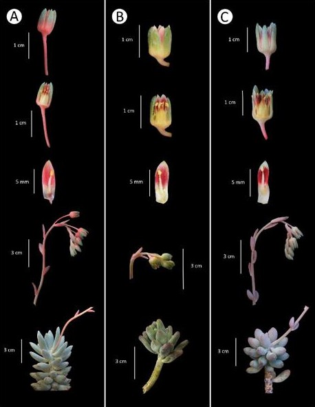Pachyphytum theodactylum is also morphologically similar to P. rzedowskii, but can be distinguished by the longer stems in the former. Its leaves are elliptic-lanceolate to oblong-elliptic in outline with a bluish-green color, the peduncle bracts are also longer and elliptic-lanceolate in shape, and the pedicels are comparatively longer. The sepals are pink at the base and green at the top, the petals are pale yellow at the base, turning pink at the top, with a pink spot on the inner side. Finally, the appendages and styles of P. theodactylum are pink (Fig. 3).