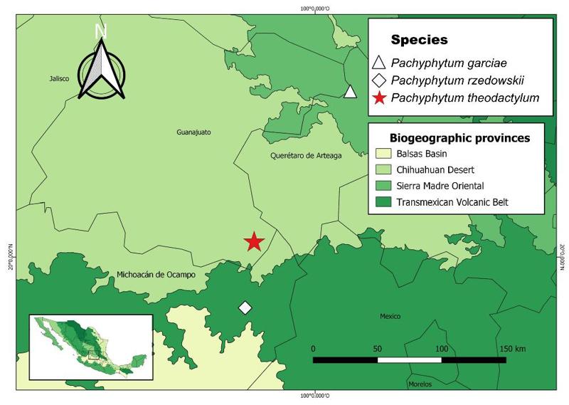 As noted by Castro-Castro et al. (2023), most species of Pachyphytum have a narrow distribution, often restricted to a single biogeographical province. The Chihuahuan Desert province stands out for its richness in this genus, as 16 species occur here, including the one described in this study. Morphologically similar species to P. theodactylum also follow this distribution pattern, with P. garciae restricted to the Sierra Madre Oriental and P. rzedowskii to the Trans-Mexican Volcanic Belt (Fig. 4). Ecological preferences among this group of species are also evident. Pachyphytum theodactylum is found in pine-oak forests at 2360 m above sea level, while P. garciae grows in submontane scrub at 1600 m, and P. rzedowskii inhabits tropical deciduous forests within an elevational range of 1800 to 2150 m.