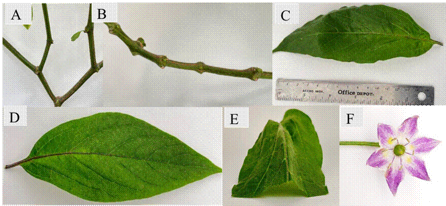 Figura 1 Características de tallo, hoja y flor de la variedad Mayito. A) uno a tres entrenudos acortados a partir de la primera bifurcación, B) longitud muy corta del entrenudo en las ramas laterales exteriores, C) limbo de la hoja largo y estrecho, D) forma llana media, E) perfil de la sección transversal cóncavo y F) pigmentación antociánica débil de los pétalos.