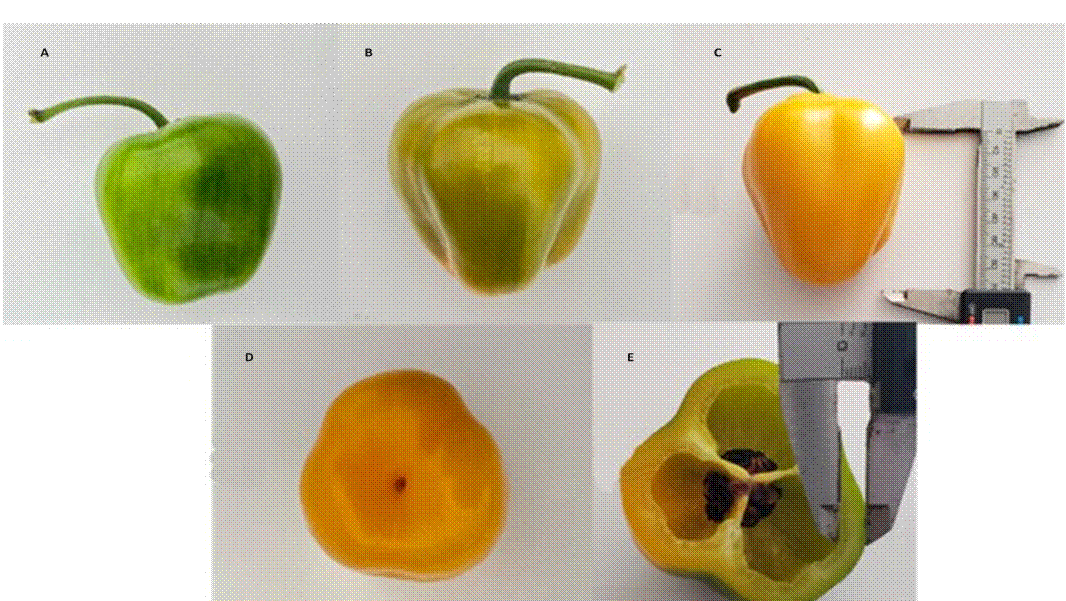 Figura 2 Características del fruto de chile manzano variedad Mayito. A) color verde claro al inicio de madurez, B) forma trapezoidal, C) color amarillo con intensidad media a la madurez, D) ápice poco profundo y E) predominantemente de tres lóculos.