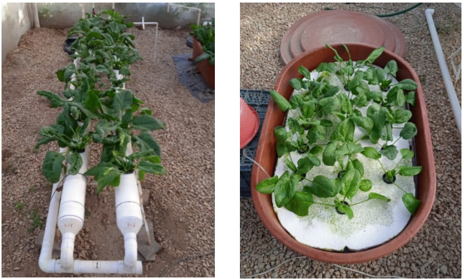 La semilla (marca Rancho los Molinos®) se sembró en octubre 07 de 2022 en charolas germinadoras de poliestireno (32.5 × 29 cm) en sustrato de peat moss marca Premier®. El cultivo creció al aire libre bajo sombra parcial (32 °C y 55 % de humedad relativa) y riego diario (250 mL de agua) hasta la formación de hojas verdaderas. El 01 de noviembre, se trasplantaron 15 plantas en cada una de las dos bandejas para HP. En TPN se emplearon dos tubos de PVC con 18 plantas en total repitiéndose esa disposición en otro sistema similar. La densidad de siembra fue distinta por la capacidad de los sistemas. El cultivo se desarrolló en invernadero (malla antiáfida 300 μm) después del trasplante en ambos sistemas, se aplicó solución nutritiva (70.72 g L-1 de fertilizante: 9-7-37 relación N-P2O5-K2O, 123 g L-1 de Ca (NO3)2 y 57.36 g L-1 de MgSO4 (marca Hort Americas®) y 40 mL L-1 de insecticida orgánico Neem con jabón potásico cada cinco días.