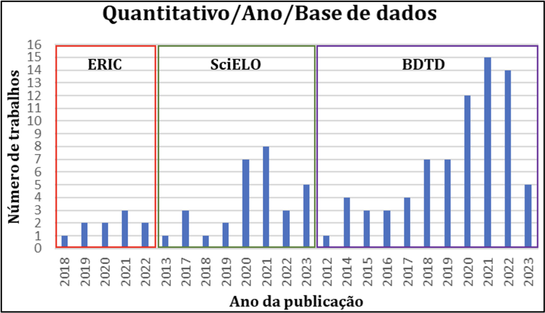 A primeira base de dados utilizada foi a ERIC (Education Resources Information Center) - Centro de Informações sobre Recursos Educacionais, que é uma biblioteca digital de pesquisa educacional bibliográfica e de texto completo, incluindo artigos de revistas e outros materiais. A segunda base de dados utilizada para a pesquisa bibliográfica, foi a Scientific Electronic Library Online - SciELO, uma biblioteca eletrônica que abrange uma coleção selecionada de periódicos científicos brasileiros. A terceira base de dados consultada no presente trabalho, foi a Biblioteca Digital Brasileira de Teses e Dissertações (BDTD), que integra os sistemas de informação de teses e dissertações existentes nas instituições de ensino e pesquisa do Brasil e possibilita o acesso e visibilidade às teses e dissertações brasileiras.