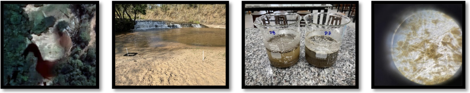 Figura 3 Coleta, processamento e inspeção visual de amostras de areia do rio local.