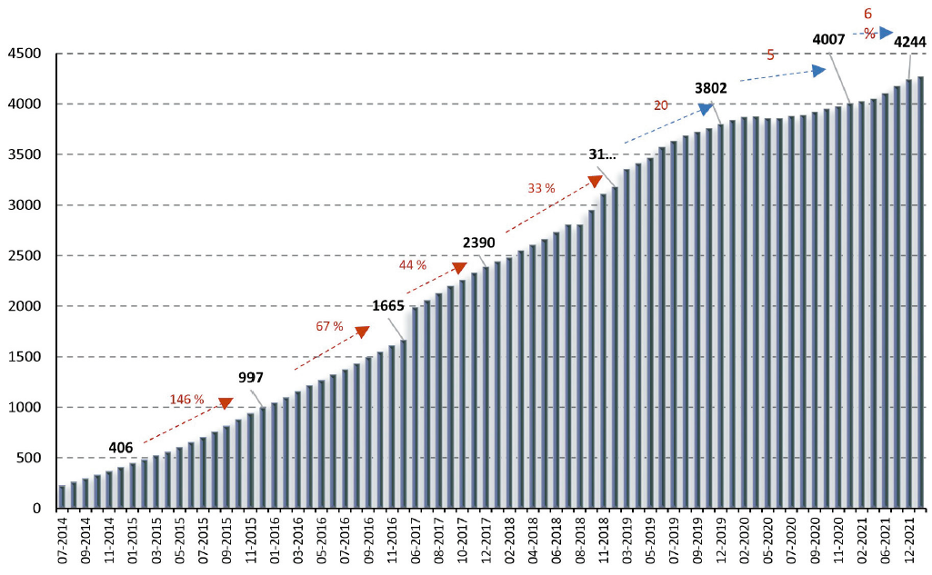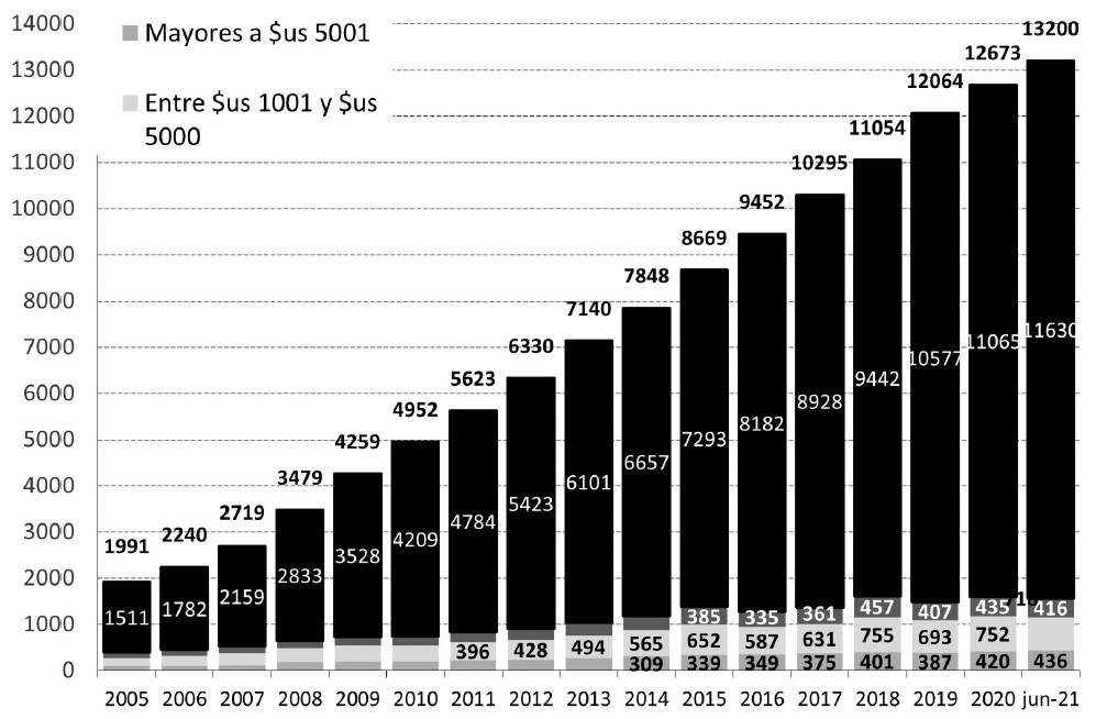 En cuanto a la experiencia boliviana, en las cuentas de depósitos se experimentó la continuidad de la democratización en el acceso a los servicios financieros, por ejemplo, las cuentas entre 500 a 1,000 dólares aumentaron 4 por ciento durante el 2020, con respecto al 2019. La tendencia se mantiene al tercer trimestre del 2021, (Gráfica 1).