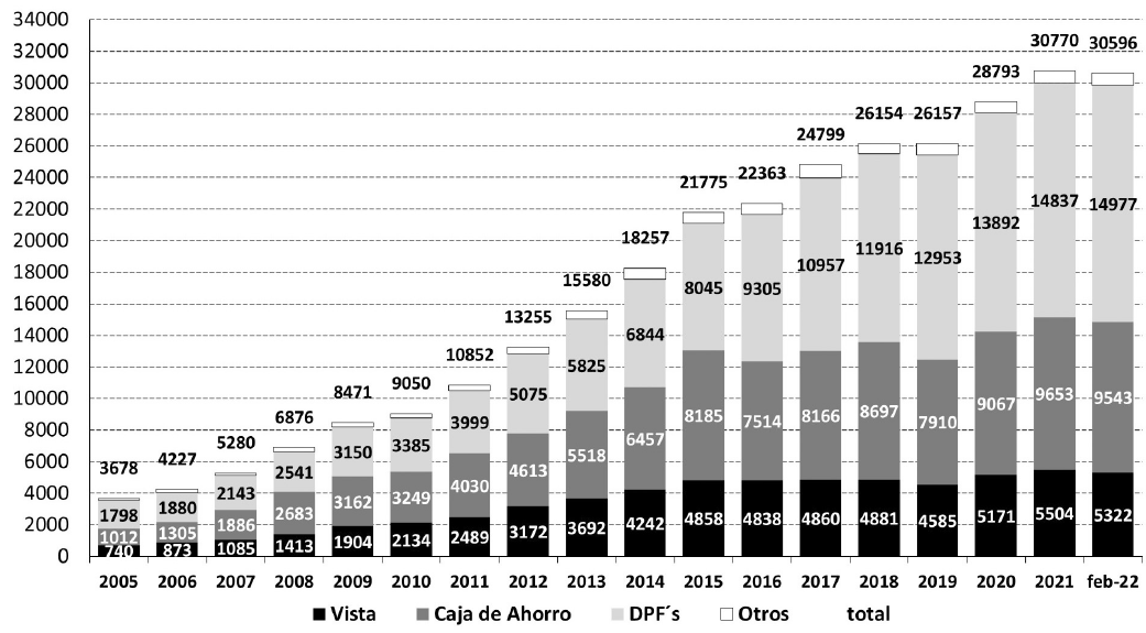 Gráfica 2 Bolivia: Depósitos del público en el sistema financiero, por modalidad de ahorro, 2005-febrero 2022. (En millones de dólares).