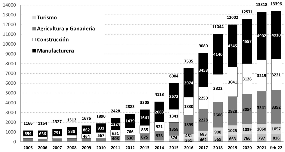 Gráfica 3 Bolivia: Crédito Productivo, 2005-febrero 2022. (En millones de dólares).