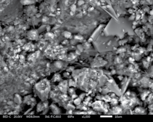 Con ayuda de un microscopio óptico fueron identificados cambios en la apariencia del concreto (Fig. 5) cuando se expuso a factores orgánicos. Estos cambios se observaron en todos los tratamientos. Las muestras observadas en el SEM fueron seleccionadas con base a su cercanía a las raíces de Albizia occidentalis, como se describió en la metodología. Las observaciones mediante EDS fueron realizadas en aquellas zonas donde los agregados no ocupaban un gran espacio en la pasta cementante en distintas magnificaciones. En las muestras de concreto de los tratamientos I, J, K, L, M, N, O y P, se detectaron los mismos cambios de degradación del material debidos a la solubilización e intemperización, presentando mayores cavidades en las zonas que se atribuyen al cementante, probablemente por la solubilización del CaCO3. En la figura 6, se observan partículas de concreto en las que se han desarrollado raíces.