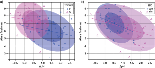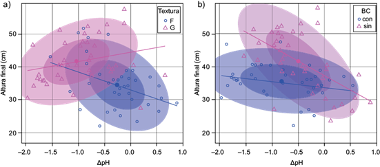 Fig. 3 Relación la altura de Z. Mays en función de los factores significativos para el ΔpH a través de análisis de componentes principales. En a) en función de la textura del concreto (F = fina, G = gruesa), en b) en función de la presencia o ausencia de biocarbón (BC). Las líneas corresponden al ajuste de mínimos cuadrados, las elipses corresponden a los elipsoides de concentración de 0.5 y 0.9.