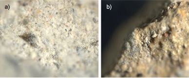 Fig. 5 Se muestra un concreto de 0.5 cm observado a través del microscopio óptico. En a) concreto antes de ser utilizado para la elaboración de tecnosuelos, en b) concreto al finalizar los ensayos, se puede observar el cambio debido a los procesos de solubilización e intemperización.