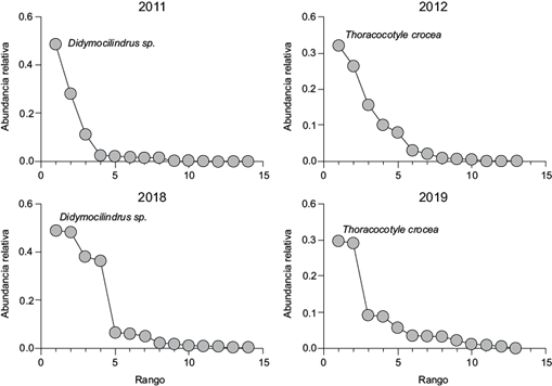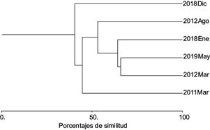 A nivel de comunidad componente, la riqueza de especies de parásitos varió significativamente de nueve en diciembre de 2018 a 14 en marzo de 2011 (t = 6.62, p < 0.01). El número total de parásitos varió de 85 en diciembre de 2018 a 2099 en marzo de 2011 (t = 7.59, p < 0.01). Los valores de diversidad variaron también de manera significativa (de 0.95 a 1.15, Cuadro II) a lo largo del periodo de estudio. El digéneo Didymocilindrus sp., el monogéneo T. crocea y el copépodo C. omissus fueron las especies que dominaron numéricamente en las comunidades de parásitos de S. sierra. La similitud entre las comunidades a este nivel varió de 13.73 a 65.78 % (Fig. 1) y fue mayor a nivel cualitativo (media = 69.10 %) que a nivel cuantitativo (media = 38.4 %). Las curvas de rango-abundancia (Fig. 2) construidas para observar posibles cambios en la estructura de las comunidades de parásitos, indicaron que la distribución de las abundancias relativas de las especies cambió notablemente entre los años de muestreo. Por ejemplo, durante 2011 y 2012 las abundancias se ajustaron a una distribución de tipo logarítmico (R2 = 0.794 y 0.994, respectivamente), mientras que en los muestreos de 2018 y 2019 una distribución de tipo log-normal presentó un mejor ajuste de las abundancias (R2 = 0.897, 0.864). Además, se registró una alternancia en la especie dominante entre los años de muestreo (Cuadro II). Por otra parte, en todos los muestreos se observó anidamiento significativo; sin embargo, el anidamiento fue más alto durante el de enero de 2018 (Tº = 9.95, Cuadro II).