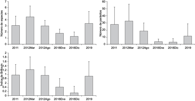Fig. 3 Valores promedio de los parámetros de infracomunidad (± desviación estándar) de la sierra Scomberomorus sierra en la bahía de Acapulco, Guerrero, México.