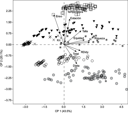Fig. 4 Dispersión del análisis de componentes principales de los factores bióticos y abióticos que influyen en la riqueza y diversidad de especies de las infracomunidades de parásitos de Scomberomorus sierra. Variables “predictoras”: Enso: valores del índice multivariado (MEI); Temperatura: valores de temperatura superficial; Estación: estación climática (secas/lluvias); Dieta: variedad de la dieta del hospedero; Kn: factor de condición de Fulton; Talla: longitud total. Parámetros de infracomunidad: Riqueza: número de especies de parásitos; H: valores del índice de diversidad de Brillouin; Equidad: uniformidad de las abundancias; Total: número total de parásitos; RDidy: número de especies de didimozoideos.