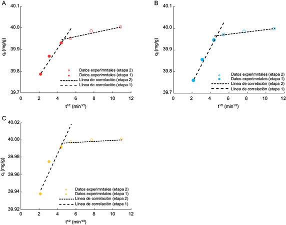 La aplicación de la ecuación 20 implica que la línea recta que resulta de graficar qt versus t1/2 debe pasar por el origen (0,0), pero un gran número de publicaciones muestran que no siempre se cumple esta condición. En este sentido, se realizó una modificación a la ecuación 20 que incluye la constante C (mg/g) relacionada con el espesor de la capa límite como se indica en la ecuación 22, el cual representa el modelo matemático de difusión intrapartícula más empleado.