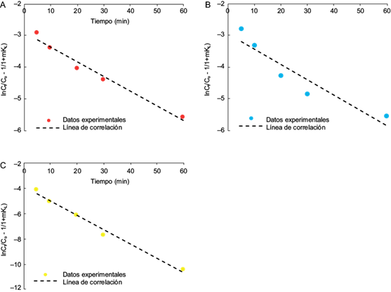 Los resultados cinéticos experimentales fueron ajustados al modelo de difusión externa graficando ln(Ct/Cº - 1/1+mKL) versus t para las tres temperaturas (Fig. 11). Aunque el cálculo de βL y SS están fuera del alcance de esta investigación, en el cuadro VIII se resumen los coeficientes de determinación calculados por regresión lineal.