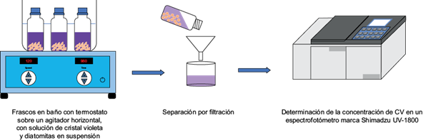 El estudio cinético consistió en adicionar 20 mL de disolución de CV, con una concentración inicial de 400 mg/L y pH 7, a 200 mg de diatomita. Estas condiciones fueron seleccionadas porque representan el inicio del equilibrio adsorción-desadsorción del proceso de remoción, como lo indican los resultados de la investigación de Castellar et al. (2022). Las muestras estuvieron en un baño con termostato (30, 35 y 40 ºC) con agitación horizontal a 120 rpm. Transcurridos 5, 10, 20, 30, 60 y 120 min, se tomó una alícuota, se filtró y se midió su concentración en un espectrofotómetro UV-Vis marca Shimadzu UV-1800. Se realizaron cuatro réplicas para un total de 72 experimentos. El esquema del estudio cinético se presenta en la figura 2.