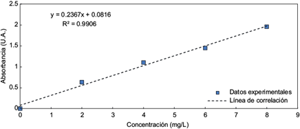 A partir de una disolución madre de CV se prepararon cuatro diluciones entre 2.0 y 8.0 mg/L y se les determinó la absorbancia a 583 nm, obtenida por barrido previo en un espectrofotómetro UV-Vis marca Shimadzu UV-1800.