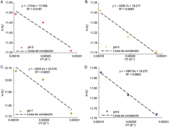Fig. 4 Ajuste de los datos experimentales a la ecuación linealizada de van’t Hoff: A) pH 5, B) pH 6, C) pH 7 y D) pH 8.