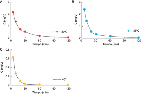 Fig. 5 Variación de la concentración del colorante cristal violeta en función del tiempo a pH 7 y Cº = 400 mg/L: (A) 30 ºC, (B) 35 ºC y (C) 40 ºC.