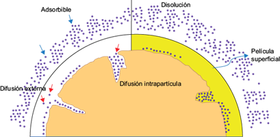Durante el proceso de adsorción es posible distinguir tres etapas importantes: i) la transferencia de masa del colorante en disolución hacia el adsorbente (difusión externa), ii) el llenado de los poros, conocida como difusión intrapartícula (Fig. 6) y iii) la adsorción del colorante mediante fuerzas intermoleculares o enlaces químicos (McKay y Allen 1980).