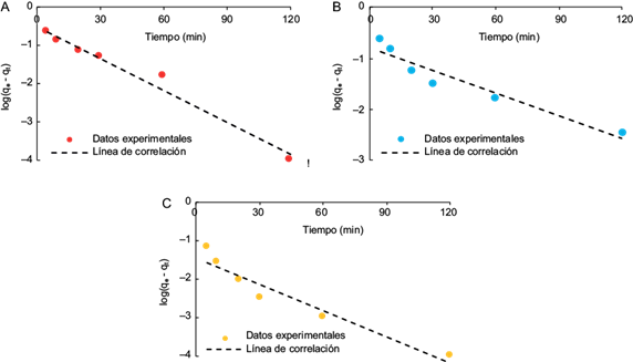 Fig. 7 Ajuste de los datos experimentales al modelo cinético de pseudoprimer orden a pH 7 y Cº = 400 mg/L: (A) 30 ºC, (B) 35 ºC y (C) 40 ºC.