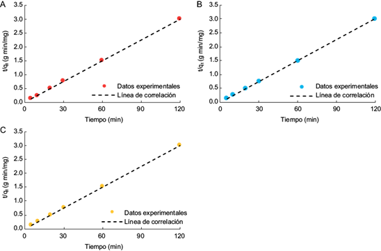 Fig. 8 Ajuste de los datos experimentales al modelo cinético de pseudosegundo orden a pH 7 y Cº = 400 mg/L: (A) 30 ºC, (B) 35 ºC y (C) 40 ºC.