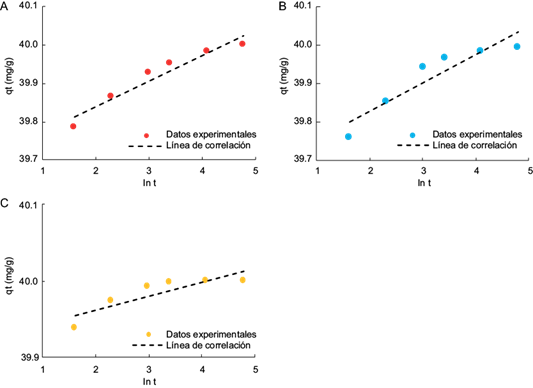 Fig. 9 Ajuste de los datos experimentales al modelo cinético de Elovich a pH 7 y Cº = 400 mg/L: (A) 30 ºC, (B) 35 ºC y (C) 40 ºC.