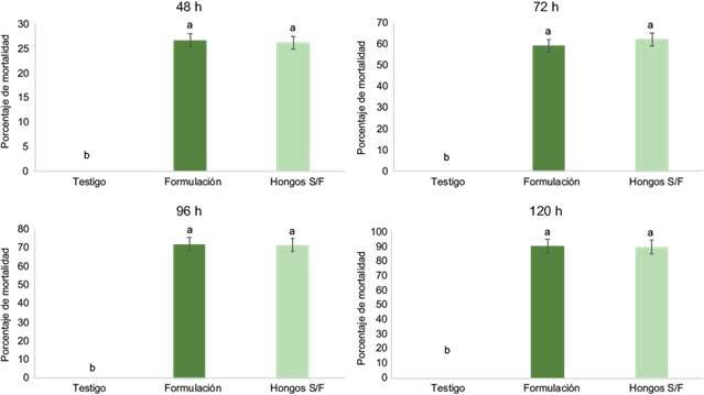 La cepa de M. anisopliae (CIDSM01) sin formular y la cepa de M. anisopliae en emulsión fueron patogénicas contra larvas del tercer instar de H. virescens a 1 × 108 esporas/mL, alcanzando la máxima mortalidad de larvas a las 120 h sin diferencia estadística significativa (Tukey p ≤ 0.05). Este ensayo indicó la efectividad de ambas cepas desde las 48, 72, 96 y 120 h después de su aplicación y mostró la efectividad del hongo en emulsión (Fig. 1).