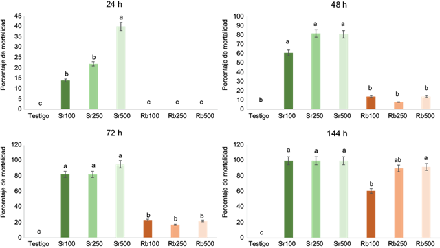 En laboratorio, los nematodos S. riobrave y R. blumi fueron virulentos para larvas del tercer instar de H. virescens. R. blumi presentó mortalidad desde las 48 h y a las 144 h alcanzó los mayores porcentajes de larvas muertas en las tres concentraciones (100, 250 y 500 JI/mL), mientras que para S. riobrave, la mortalidad de las larvas se presentó desde las 24 h (pi), alcanzándose el 90 % de mortalidad las 48 h, con diferencia estadística en la prueba de Tukey (p ≤ 0.05) (Fig. 2). Por esta razón se eligió a S. riobrave para elaborar la formulación en cápsulas de alginato a una concentración de 250 JI/mL, además de que la mortalidad de larvas fue estadísticamente igual a la del tratamiento con 500 JI/mL (Fig. 2).