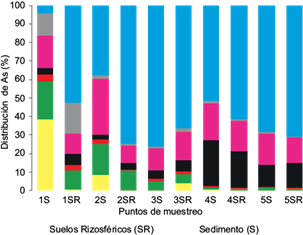 Fig. 3 Distribución porcentual de As en extracción secuencial aniónica en sedimentos (S) y en suelos rizosféricos (SR) de A. fistulosus; ■ Fracción soluble, ■ Intercambiable catiónico, ■ Asociado a carbonatos, ■ Intercambiable aniónicamente, ■ Asociado a oxihidróxidos de hierro y manganeso, ■ asociada a materia orgánica y sulfuros y ■ fracción residual.
