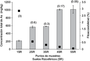 El análisis de fitoaccesibilidad para suelos rizosféricos simuló las condiciones de la rizósfera por medio de una solución de ácidos orgánicos de bajo peso molecular. La concentración de arsénico total versus el porcentaje de fitodisponibilidad, calculado con base en esta concentración total, indica el porcentaje que podría ser absorbido por la planta a través de la rizosfera (Fig. 4 ).