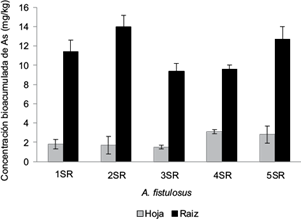 Considerando los resultados de la sección anterior, se determinaron las concentraciones bioacumuladas de As en hojas y raíces de A. fistulosus (Fig. 5). Se encontró que la especie A. fistulosus retiene el arsénico principalmente en las raíces.