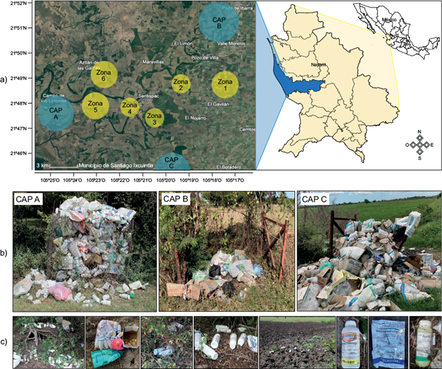 Fig. 1 Zona de estudio en el municipio de Santiago Ixcuintla, Nayarit, México. a) los círculos azules indican los centros de acopio primario (CAP: A, B, C), mientras que los amarillos las zonas agrícolas censadas a campo abierto. b) Centros de acopio primario (CAP) localizados en la zona de estudio. c) Ejemplos de envases vacíos dispersados en campo abierto.