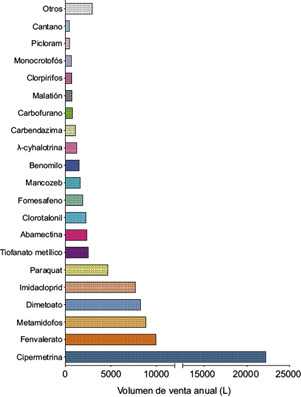 La cipermetrina fue el IA más vendido durante el año (volumen de ventas anual estimado: 22 250 L) seguido del fenvalerato (volumen de ventas anual estimado: 10 000 L) y el metamidofos (volumen de ventas anual estimado: 8892 L) (Fig.2), entre otros como el glifosato (datos no presentados).