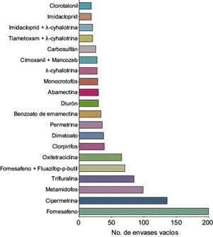 Los envases vacíos de plaguicidas sintéticos se clasificaron según el control de plagas. La mayoría correspondió a insecticidas (43.6 %) y herbicidas (34.4 %), seguido de fungicidas (14.4 %) y bactericidas (6.4 %), entre otros (1.0 %). De los 41 grupos químicos identificados, el 14.8 % de los envases vacíos corresponden a plaguicidas organofosforados (OF), seguido de piretroides (PYR, 14.2 %) y éteres de difenilo (13.7 %). Aunque en una proporción baja, los compuestos organoclorados (OC) como el dicofol, continúan empleándose en la zona de estudio (0.2 %). Se identificaron 74 IA distintos, la mayoría de los envases vacíos pertenecían a fomesafeno (13.7 %), cipermetrina (9.3 %), metamidofos (6.8 %) y trifluralina (5.8 %). Asimismo, se identificaron mezclas de IA como fomesafeno + fluazifop-p-butil (4.9 %), Cimoxanil + mancozeb (1.9 %), imidacloprid + λ-cyhalotrina (1.4 %) y tiametoxam + λ-cyhalotrina (1.4 %). La figura 3 representa los 20 IA y mezclas de IA con mayor número de envases vacíos en la zona.