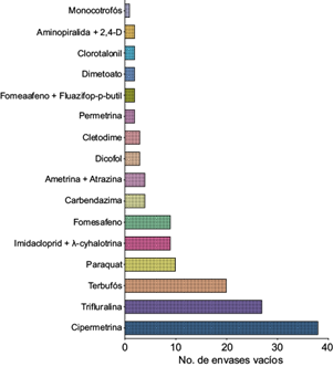 De acuerdo con los datos registrados en campo abierto, se localizaron 138 envases de plaguicidas abandonados en parcelas y caminos agrícolas (Fig. 1c) y 17 envases de bioinsumos (extractos vegetales y algas marinas). Los envases vacíos más utilizados, abandonados en campo abierto después de su aplicación (Fig. 4), fueron de cipermetrina, trifluralina, terbufós y paraquat. Asimismo, se observó que algunos envases de plaguicidas son quemados o arrojados a canales de riego o cuerpos de agua como una forma fácil de eliminarlos.