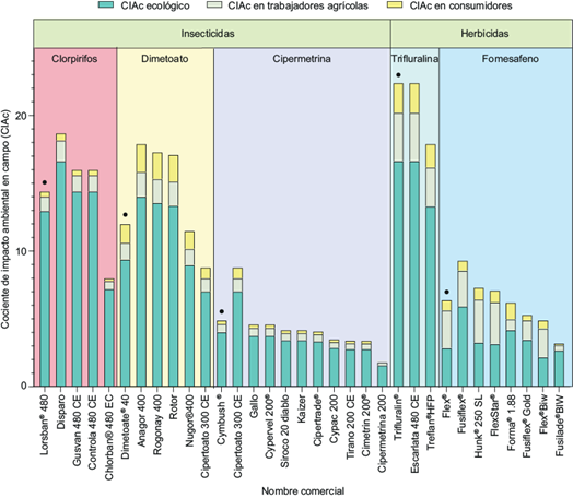 Adicionalmente, con el CIA se puede realizar un análisis sobre diferentes estrategias o programas de manejo de plagas aplicando la calificación del CIAc (Kovach et al. 1992). Tal como es reportado en Vargas-González et al. (2019), la toxicidad inherente de un plaguicida, considerado como el nivel de peligro, difiere de su riesgo potencial de daño al ambiente y a la salud humana cuando se consideran factores de exposición o variables de uso en campo (porcentaje de IA en la formulación, la dosis y el número de aplicaciones). Los valores de CIAc permiten observar que algunas formulaciones con IA de bajo impacto ambiental, pueden volverse peligrosas por la suma de las aplicaciones durante el desarrollo del cultivo. Por ejemplo dos IA con CIA altos como carbofuran (CIA = 50.67) y carbendazim (CIA = 50.50), utilizados en campo al 35 % y al 50 % de IA en la formulación, respectivamente, cambiaron en los valores de CIAc con 42.6 para el cerbendazim y 22.6 para el carbofuran, esto debido a una mayor cantidad de IA contenido en la formulación y a un mayor número de aplicaciones de carbendazim que de carbofuran (Vargas-González et al. 2019). En el mismo sentido, el CIAc ha permitido establecer que la elección de la formulación juega un papel clave en las prácticas agrícolas sostenibles (March 2014).