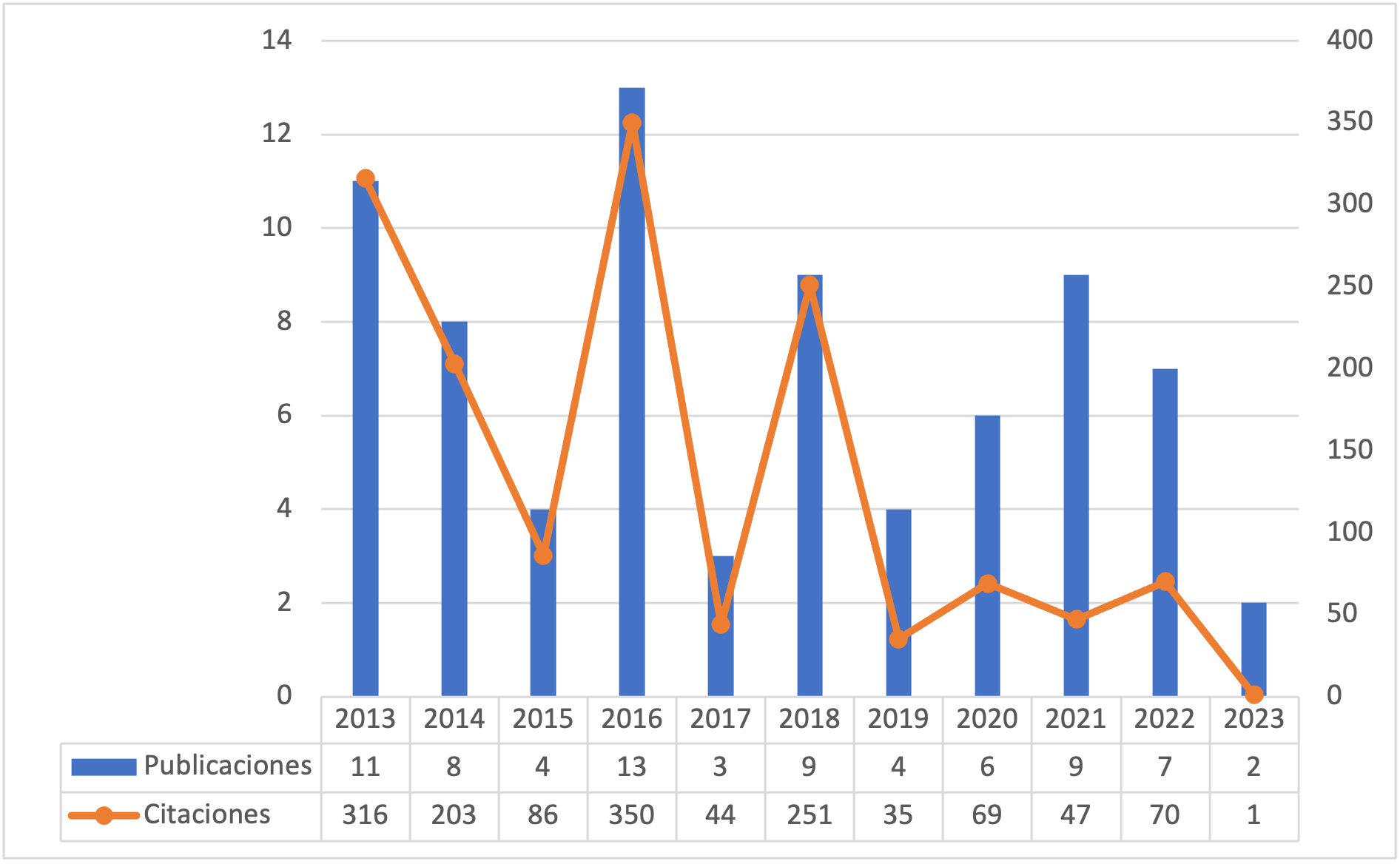 La publicación de artículos de huertos familiares en el contexto de la sostenibilidad de los últimos 10 años (2013-2023) evidencia una relación directa entre el número de artículos y las citaciones (Figura 1).