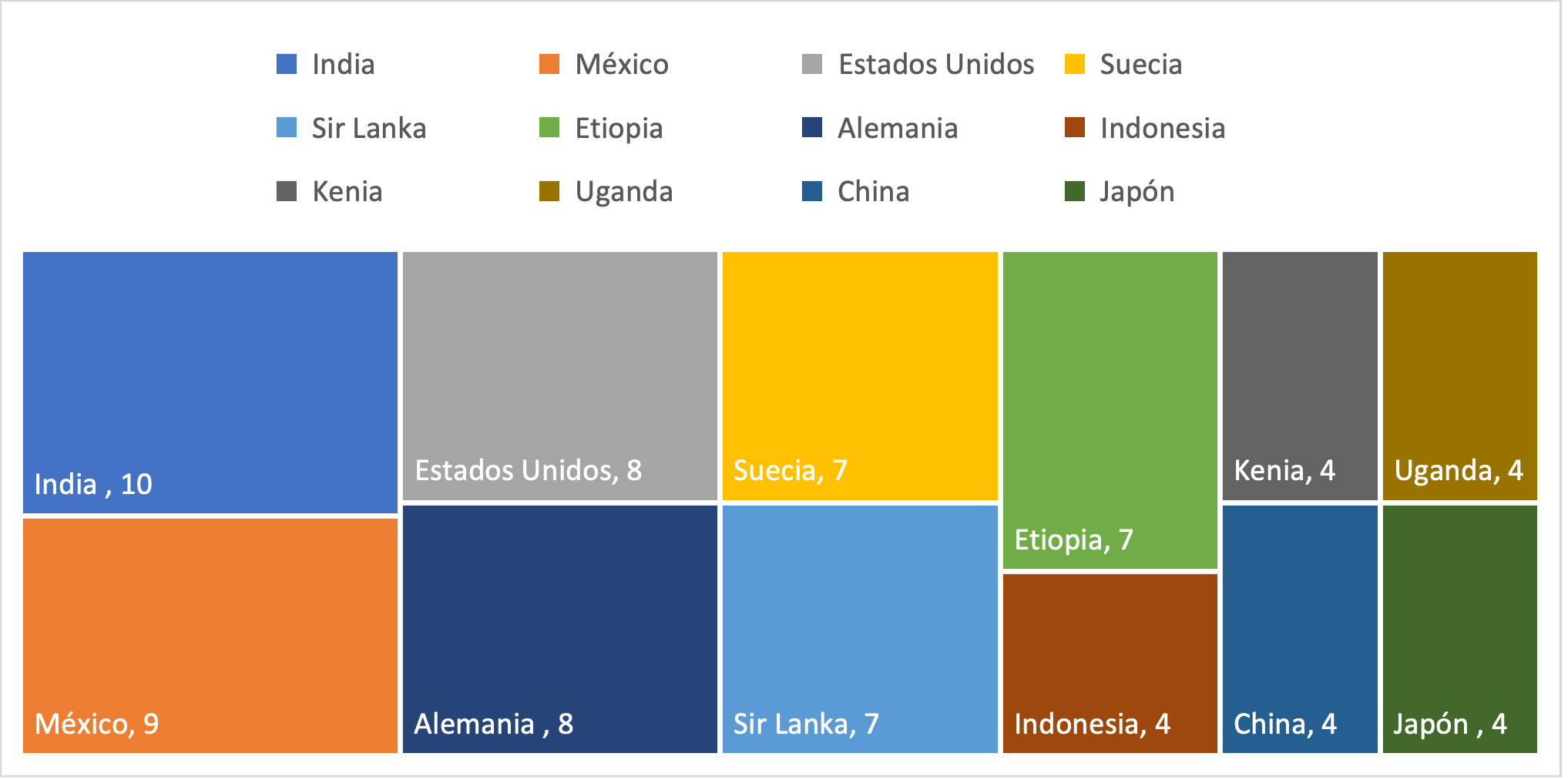 En cuanto a la producción por área geográfica (Figura 2), la India ocupa el primer lugar en productividad con el 13%, resaltando temas como gobernanza (Balooni et al., 2014) y biodiversidad (Jeeceelee & Sahoo, 2022). México se encuentra en segundo lugar con el 11% de las publicaciones, las cuales promueven la biodiversidad (Larios et al., 2013); los servicios ecosistémicos, el alcance y las limitaciones del desarrollo sostenible (Rajagopal et al., 2021); así como el huerto familiar considerado como una práctica social (Lope, 2017). En tercer lugar, se encuentran Estados Unidos y Alemania con un 10% cada uno en temas de etnobotánica (Bussmann et al., 2017) y prácticas culturales (Toledo-Hernández et al., 2016). En cuarto lugar, con un 9%, se ubican Suecia (Gebrehiwot et al., 2016) y Sri Lanka (Lowe et al., 2021), que abordan el tema de seguridad alimentaria. Finalmente, con un 5%, están Indonesia (Abdoellah et al., 2020) y Kenia (Whitney et al., 2018b), que también estudian los aportes a la seguridad alimentaria. Además, China destaca los cambios en los huertos familiares (Hu et al., 2023), Uganda analiza la agrobiodiversidad dentro del huerto (Mwavu et al., 2016) y Japón investiga los efectos de las características de los hogares en las características de los huertos familiares (Jamnadass et al., 2013).