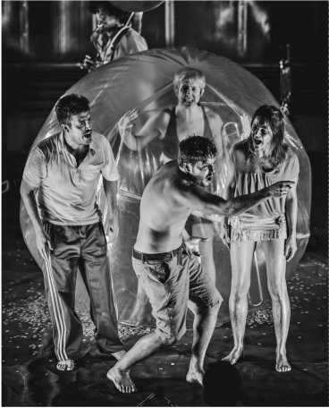 Através de los cristales que componen el costado del Teatro de Contêiner Mungunzá1 podía verse desde afuera el interior del teatro, donde se encontraban los siete actores y actrices saltando en círculo, dejando fluir la adrenalina, llevando a cabo una suerte de ritual en el que al acabar todas(os) gritaron en diversas ocasiones y de forma conjunta: