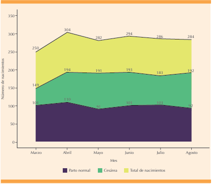 La distribución mensual de todos los nacimientos por tipo de resolución fue variable, la cesárea fue mayor en abril y junio (194 y 193 respectivamente) y la menor en marzo con 149. Los partos normales fueron mayores en abril (n= 110) donde hubo más nacimientos en total (n = 304) y la menor cantidad de partos ocurrió en agosto (n = 92). Figura 1