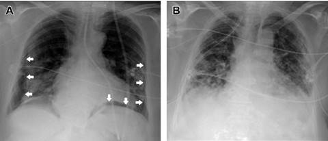 Figura 1: A) Imagen de la sonda nasogástrica posicionada a través del bronquio izquierdo y neumotórax bilateral (flechas). B) Reexpansión de los neumotórax tras la retirada de la sonda y la colocación de dos drenajes torácicos.
