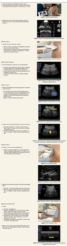 Se incluyeron un total de 113 pacientes en el estudio, con una edad promedio de 55.8 ± 15.2 años, entre los cuales 55.8% fueron mujeres. La colocación del catéter fue principalmente en T11-T12 en 62% de los casos. La media de fijación del catéter desde la piel fue de 10.8 ± 2.3 cm. La obtención de los pasos secuenciales del protocolo de escaneo con ultrasonido descritos en la Figura 1 se realizó conforme se adquirió experiencia. Se observó que la aspiración inicial sin administrar líquido a través del catéter con la generación de un mosaico de color podía proporcionar una localización más precisa del catéter a partir del sitio de inserción. Además, se encontró que administrar más de 0.5 mL de solución salina por el catéter para producir un flujo turbulento era suficiente en la aparición de un mosaico de color. Sin embargo, al administrar una cantidad mayor, se observó que la detección del mosaico se volvía difícil o imposible, lo que sugiere una posible saturación del catéter y del espacio epidural. También se identificó en dos pacientes que los catéteres insertados a más de 15 cm no eran detectados por el ultrasonido, por lo que fue necesario retirarlos algunos centímetros para poder visualizar el mosaico de color.