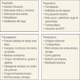 | Optimización(5) | Reconocimiento temprano de factores de riesgo y la optimización preoperatoria de comorbilidades y malos hábitos. |