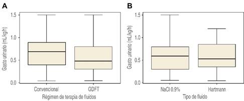 Figura 1: Comparación del gasto urinario con el tipo de régimen utilizado (A), y con el tipo de fluido utilizado (B).