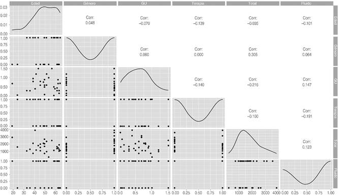 En términos de comparación con base en el tipo de solución, el grupo de Hartmann presentó mayor uresis, 0.68 vs 0.5 mL/kg/hr respectivamente, sin ser tampoco estadísticamente significativo, p = 0.40. El resto de las comparaciones se muestra en las Tablas 2 y 3. El análisis de matriz de correlación no mostró ninguna correlación significativa (Figura 2).