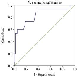 Se buscó establecer un valor de ADE al ingreso que permitiera predecir pancreatitis aguda grave, definida de acuerdo con la revisión de la clasificación de Atlanta de 2012 como la presencia de falla orgánica persistente, independientemente de la presencia de complicaciones locales. Mediante curva ROC se encontró que con un punto de corte de 14.95%, el ADE tiene una sensibilidad de 73.3% y una especificidad de 79.1% para predecir pancreatitis grave. Con este punto de corte, se observó que los pacientes con un valor de ADE al ingreso > 14.95% tienen un riesgo 10 veces mayor de desarrollar pancreatitis aguda grave, en comparación con los casos con un ADE menor al ingreso.
