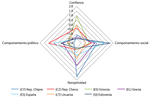 También son predominantes los valores negativos en “comportamiento político” y “comportamiento social”, salvo para España, República Checa y Chipre. Esto significa que, aunque ambos factores influyan positivamente en el PIB per cápita dado el valor de su coeficiente (β), el valor específico en cada país (F) hace que ni el “comportamiento social” ni el político sumen a la variable dependiente. No se cuenta con literatura que ayude a explicar esto (como sí se cuenta para explicar la relación inversa de la riqueza con la confianza), y lo que ahora se puede apuntar al respecto es sólo tentativo, algo así como que es posible que en países de economías débiles todavía no está muy articulado el comportamiento social ni la receptividad como para que pueda tener un efecto positivo en el crecimiento.