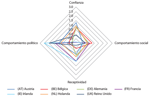 | País | Confianza | Comportamiento social | Receptividad | Comportamiento político |